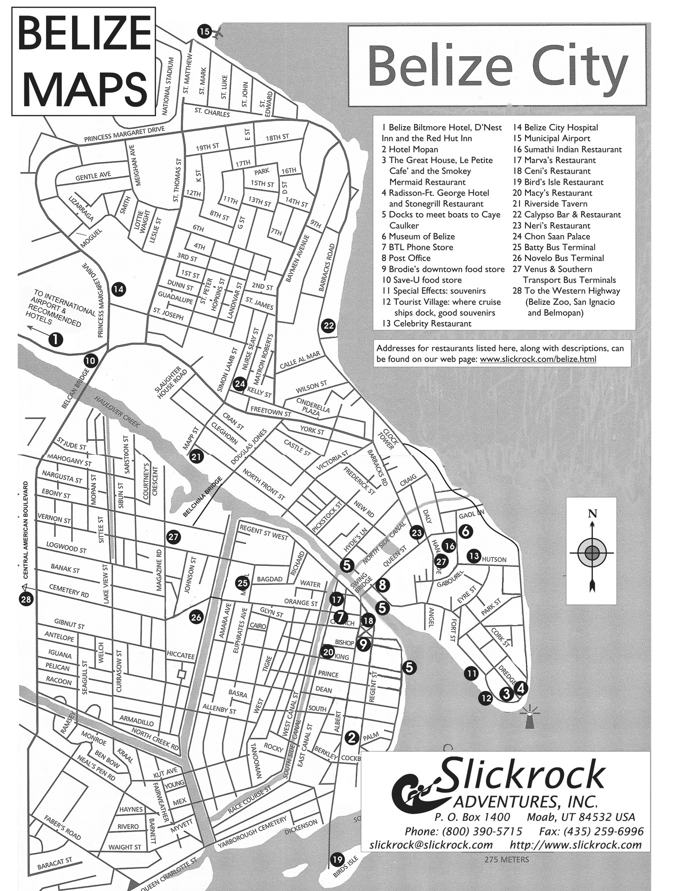 This Belize City, Belize map includes all of the street names in downtown Belize City. It also locates our favorite restaurants and hotels, where to shop for cool tourist items, and other important locations like the museum, ferry docks to Ambergris Caye and Caye Caulker, grocery stores, and the post office.