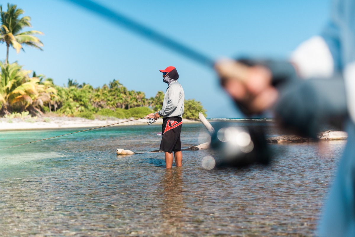 Wading is very easy on the flats near our shore and more challenging on the reef edge. The west end of the island and prime fishing areas on nearby islands have shallower sand flat zones with turtle grass coverage where solitary bonefish are often found. These tend to be the larger bonefish (cruisers), and a lighter fly works better in these areas. The areas of transition between the turtle grass and sand flats are generally the best areas to find these larger, solitary bonefish. There are also areas on the windward side of the island where you can cast into the surf zone, either into coral reefs or rubble shoals, where jack and snapper, as well as reef fish, are more easily caught.