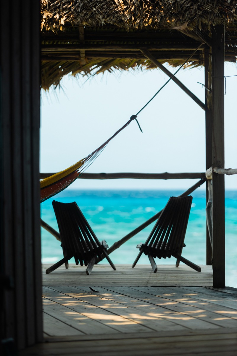 Each cabana has single or double beds, a solar-powered light, and a porch with hammocks and lounge chairs (see the island accommodations page for more photos and information).